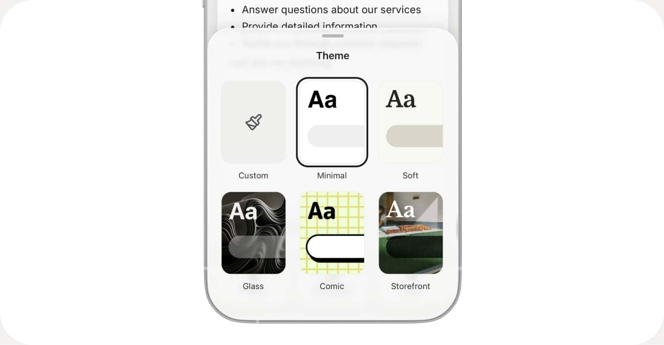 Choose from pre-designed themes that give a disctinct look to your chatbot. Currently we offer 5 themes but more will launch soon so check back to find new design templates in the future. You can also pick "Custom" to customize every part of the chatbot.